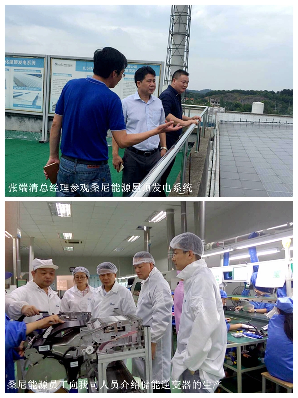 ??? 张端清总经理一行参观了桑尼能源生产基地、光伏建筑一体化屋顶发电系统项目,并对其拳头产品储能逆变器的生产流程进行了现场考察。随后双方就AG尊时凯龙人生就融资租赁为桑尼能源提供供应链金融服务进行了广泛深入地交流和磋商。会议中,张端清总经理与李新富董事长对桑尼能源目前的经营情况及未来发展规划进行了深入交流,并就供应链金融合作进行了探讨。