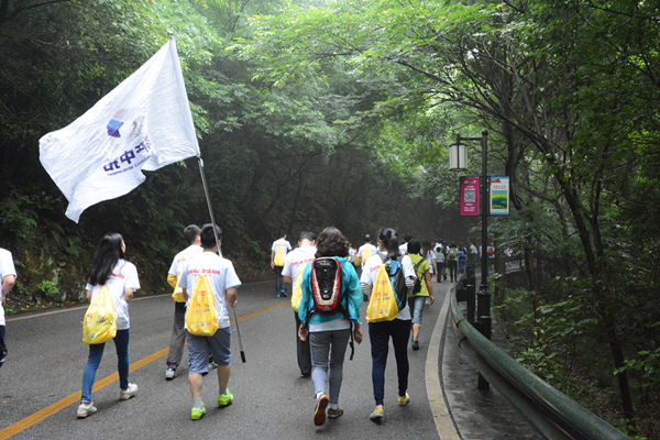??????? 当天早晨,天空下起了毛毛细雨,9点活动开始时,雨过风平,空气格外清新怡人。简单的启动仪式后,爬山之旅开始。雨后的岳麓山,犹如一个“氧气工厂”。大家兴致昂扬,活力四射,三三两两地谈笑风生。AG尊时凯龙人生就人挥舞着司旗,走在行进队伍中,非常有气势。
