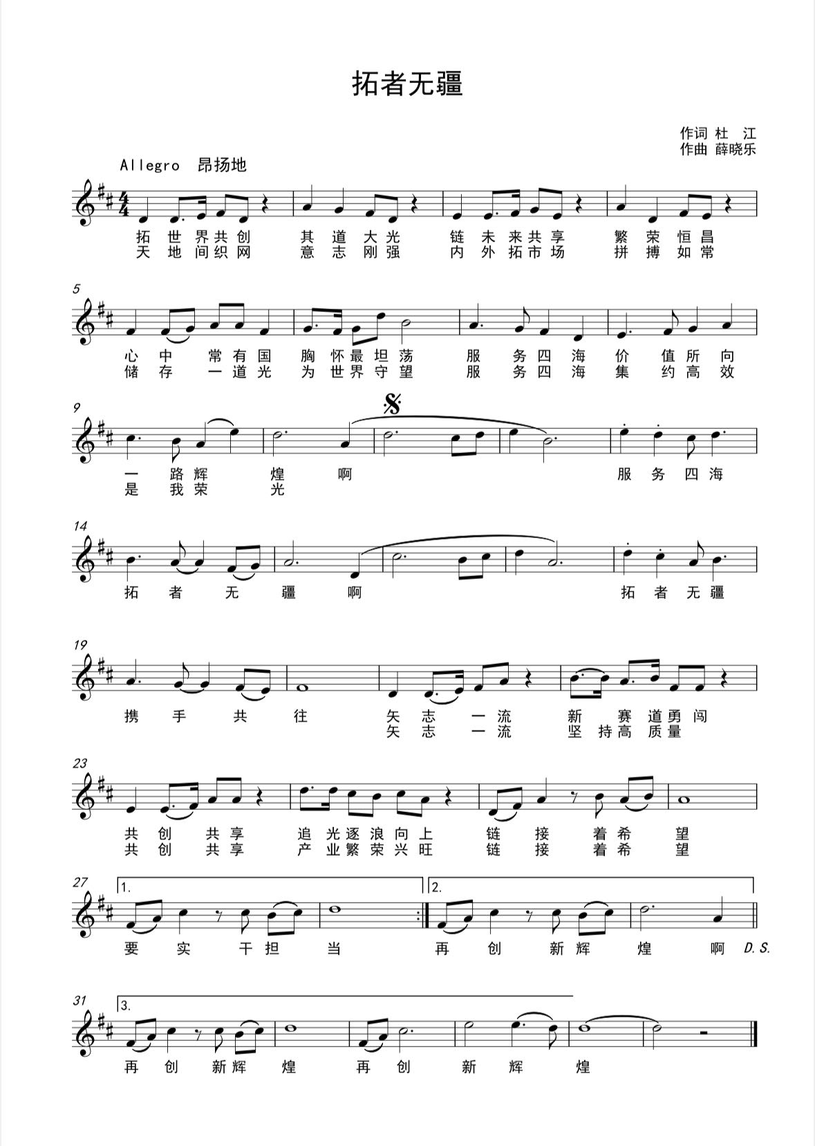 司歌歌名蕴含公司“拓”的文化基因,“无疆”既代表公司立足国内、放眼全球的广阔视野,也寓意公司在新时代新征程上,团结奋斗打开事业发展新天地的壮阔前景。